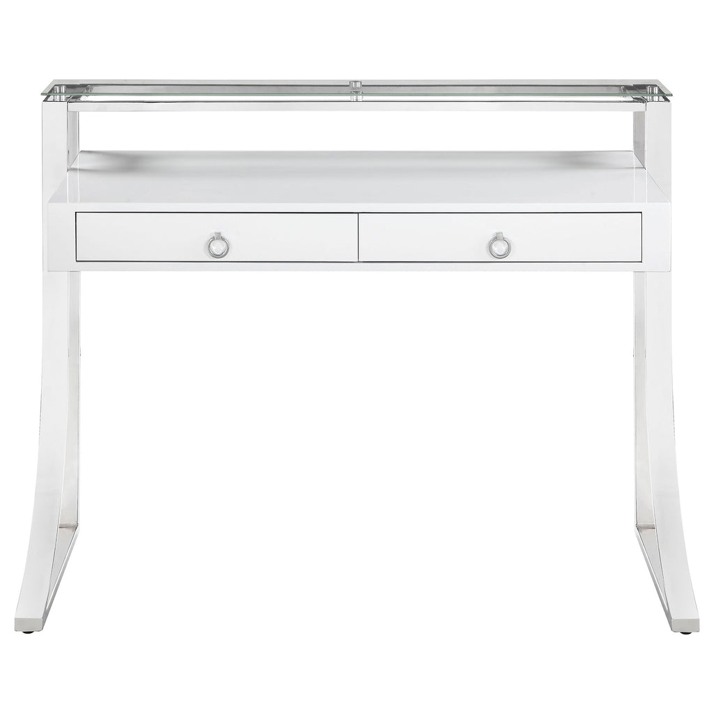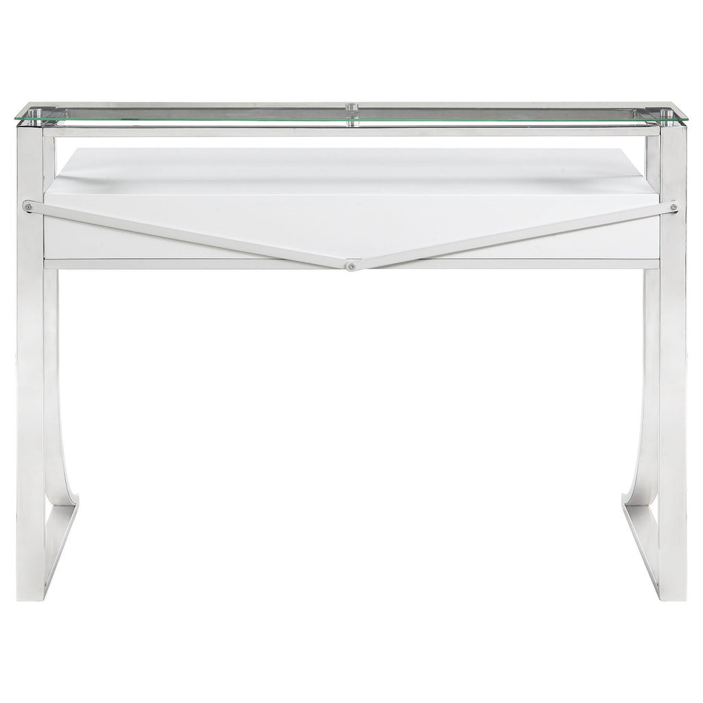 Add an edge of contemporary flair to any living space. This sleek, stylish writing desk exudes glamorous appeal. Its eye-catching frame is expertly crafted with a gracefully curved silhouette. Its gorgeous, glossy white surface blends appealingly with its shining chrome legs. Complete with two felt-lined drawers with full extension glides, this desk enhances any home office with convenience and modern style. Key Features: • Classic writing desk in high gloss white lacquer finish • Metal frame electroplated in polished chrome finish • Hutch includes clear tempered glass for strength • Desk features two (2) drawers with full extension glides • Metal, glass, and MDF construction